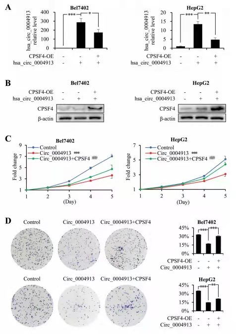 在Bel7402和HepG2細(xì)胞中生成hsa_circ_0004913-OE細(xì)胞,然后用CPSF4質(zhì)粒轉(zhuǎn)染。分別通過(guò)蛋白質(zhì)印跡和實(shí)時(shí)PCR檢測(cè)每個(gè)細(xì)胞系中的CPSF4蛋白和hsa_circ_0004913表達(dá)水平(圖 4A,B)。與對(duì)照細(xì)胞相比,hsa_circ_0004913-OE細(xì)胞顯示出較慢的增殖和較低的克隆形成。然而,CPSF4的OE可以消除hsa_circ_0004913的腫瘤抑制作用,因?yàn)镃PSF4轉(zhuǎn)染后生長(zhǎng)速度和克隆形成能力恢復(fù)(圖 4C,D)。這些結(jié)果表明circRNA在CPSF4介導(dǎo)的HCC細(xì)胞腫瘤發(fā)生中的重要作用。