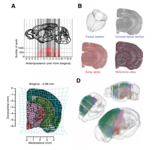 通過使用全腦空間轉(zhuǎn)錄組學(xué)基于對(duì)空間定義特征的無偏識(shí)別來生成成年小鼠大腦的系統(tǒng)分類。研究發(fā)現(xiàn)分子信息足以推斷大腦的復(fù)雜而詳細(xì)的神經(jīng)解剖組織結(jié)構(gòu)。無監(jiān)督分類顯示了特定于區(qū)域和層的子區(qū)域,在等皮層和海馬體以及紋狀體的新亞區(qū)。分子圖譜進(jìn)一步支持了從單細(xì)胞RNA圖譜中表征神經(jīng)元的空間特性,并提供了使用最小基因集(大腦調(diào)色板)為大腦添加注釋的資源。總之,本研究建立了一個(gè)分子圖譜來正式定義大腦區(qū)域的空間組織,包括用于映射和靶向離散神經(jīng)解剖結(jié)構(gòu)域的分子代碼,通過空間維度直觀詮釋了大腦組織不同空間區(qū)域特征,為剖析大腦組織提供了全面的時(shí)空?qǐng)D譜。