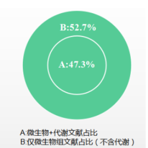 小編先在PubMed網(wǎng)站搜索了一下微生物組和代謝在2011-2020年的發(fā)文情況。以微生物組和代謝組為關(guān)鍵詞搜索文獻(xiàn)數(shù)量信息。從數(shù)據(jù)中我們可以看到,微生物和代謝相關(guān)文章在逐年增加,47.3%的微生物發(fā)表文獻(xiàn)中都包含代謝組,微生物組+代謝組研究已逐漸成為微生物研究中的重要多組學(xué)研究思路。
