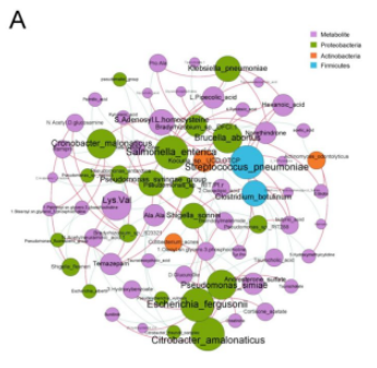 主要結(jié)果:慢性阻塞性肺疾病(COPD)是全球第三常見(jiàn)的死亡原因,表現(xiàn)為一種持續(xù)炎癥性肺部疾病,沒(méi)有根治方法。肺部微生物群促進(jìn)了COPD的發(fā)展,但腸道微生物群的功能仍不清楚。在該研究中,研究者比較了COPD患者和健康對(duì)照組的糞便微生物組和代謝組,發(fā)現(xiàn)146種細(xì)菌在兩組之間存在差異。運(yùn)用非靶向代謝組學(xué)鑒定出COPD的特征包括46%的脂質(zhì)、20%的異型生物質(zhì)和20%的氨基酸相關(guān)代謝物,通過(guò)相關(guān)性分析,構(gòu)建了Streptococcus parasanguinis_B與COPD疾病相關(guān)代謝產(chǎn)物之間的相關(guān)網(wǎng)絡(luò),COPD患者的糞便微生物組和代謝組與健康人不同,可能有助于尋找COPD的生物標(biāo)志物。