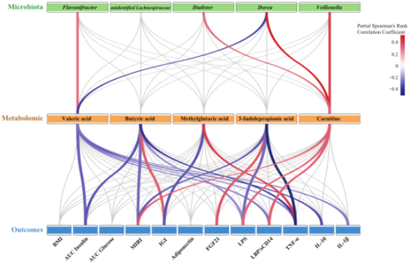 圖3.腸道菌群、共代謝物和葡萄糖穩(wěn)態(tài)、腸道健康和炎癥的生物標(biāo)志物之間的相關(guān)性分析。