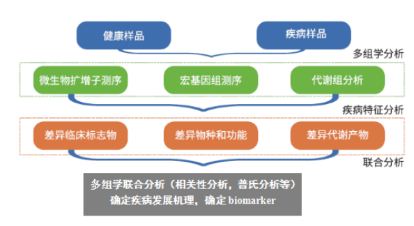 ?微生物組測(cè)序(主要指擴(kuò)增子測(cè)序與宏基因組測(cè)序)可提供微生物組成、基因功能和豐度信息,而代謝組學(xué)是研究生物體中代謝產(chǎn)物變化的科學(xué)。生物科學(xué)研究過(guò)程復(fù)雜,單—組學(xué)往往無(wú)法全面的解決生物學(xué)問(wèn)題,多組學(xué)就顯得尤為重要。近年來(lái),隨著微生物組學(xué)研究的不斷發(fā)展和持續(xù)火熱,越來(lái)越多的研究者開(kāi)始將微生物組學(xué)和代謝組學(xué)聯(lián)合起來(lái),從物種、基因以及代謝產(chǎn)物等水平共同解釋科學(xué)問(wèn)題,更好地理解疾病過(guò)程及機(jī)體內(nèi)物質(zhì)的代謝途徑,還有助于發(fā)現(xiàn)疾病的生物標(biāo)記以更進(jìn)—步應(yīng)用千臨床輔助診斷。