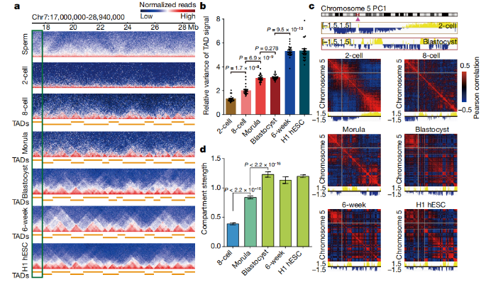 總之,這些數(shù)據(jù)表明,TAD結(jié)構(gòu)在人的2細(xì)胞胚胎中基本上不存在,在8細(xì)胞胚胎中很少存在,并且在胚胎發(fā)育過(guò)程中變得越來(lái)越明顯。