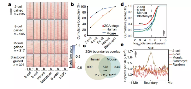 TAD結(jié)構(gòu)在人類2細(xì)胞胚胎中并不明顯。但是,兩細(xì)胞胚胎中的某些區(qū)域顯示出絕緣子結(jié)合的跡象,可以分隔上游和下游相互作用。在胚胎后期,這些區(qū)域大部分成為TAD邊界(圖3a); 這些區(qū)域因此可以被視為未成熟的TAD邊界。在這項(xiàng)研究中,本研究將未成熟的TAD邊界和成熟的TAD邊界都定義為絕緣邊界。然后,本研究分析了人類胚胎發(fā)育過(guò)程中絕緣邊界的動(dòng)力學(xué)。本研究的數(shù)據(jù)表明,分別在2細(xì)胞,8細(xì)胞,morula 和胚泡階段分別形成635、905、317和306個(gè)絕緣邊界(圖3a)。本研究還在小鼠2細(xì)胞胚胎中發(fā)現(xiàn)了未成熟的TAD邊界,并確定了小鼠階段獲得的絕緣邊界。比較了人類樣品中2細(xì)胞階段的絕緣邊界與胚泡階段的總邊界,結(jié)果表明2細(xì)胞邊界與胚泡邊界的30%重疊(圖3b)。本研究的數(shù)據(jù)還顯示ZGA階段包含胚泡中67%的邊界,這與小鼠模型中的比例相似(圖3b)。此外,當(dāng)將ZGA階段的人類邊界與小鼠的邊界進(jìn)行比較時(shí),發(fā)現(xiàn)存在明顯的重疊(圖3c)。例如,本研究在人和小鼠的ZGA階段發(fā)現(xiàn)了TTC1和CCNG1基因周圍的絕緣邊界。