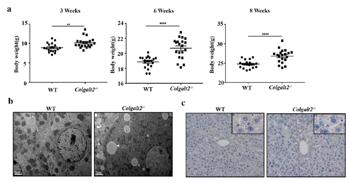 通過(guò)肝組織的PCR和western blotting,結(jié)果顯示Colgalt2?/?小鼠中不表達(dá)COLGALT2。在3,6,8周齡時(shí)分別對(duì)Colgalt2?/?和WT小鼠稱重,結(jié)果顯示Colgalt2敲除增加了小鼠的體重(圖1a)。通過(guò)透射電鏡觀察發(fā)現(xiàn),6周齡Colgalt2?/?小鼠肝細(xì)胞中有脂滴聚集(圖1b)。然而,在6-8 周齡時(shí),WT小鼠和Colgalt2?/?小鼠的肝油紅O染色和TG含量沒(méi)有明顯差異(圖1c)。