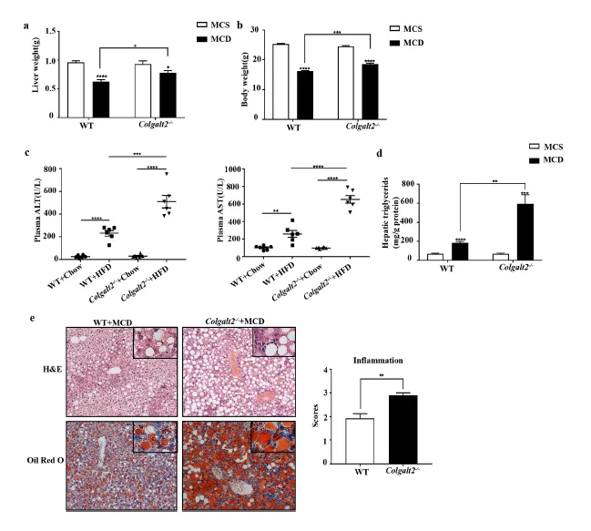 NASH是NAFLD疾病進(jìn)展階段。為了研究 Colgalt2對(duì)MCD誘導(dǎo)的脂肪性肝炎的影響,WT和Colgalt2?/?小鼠連續(xù)喂食MCD飲食3周。與WT小鼠相比,Colgalt2?/?小鼠的體重和肝臟重量增加(圖3a和b)。在MCD喂養(yǎng)的小鼠中,Colgalt2?/?小鼠的ALT和AST血漿水平及AST均顯著升高(圖3 c)。H&E和油紅O染色顯示,MCD喂養(yǎng)的Colgalt2?/?小鼠的肝臟脂肪變性和炎癥浸潤(rùn)比WT小鼠更嚴(yán)重(圖3e)。與此同時(shí),與WT小鼠相比,MCD喂養(yǎng)的Colgalt2?/?小鼠肝臟TG含量顯著增加(圖3d)。在MCD飲食組中,Colgalt2?/?小鼠的炎癥評(píng)分明顯高于WT小鼠(圖3e)。
