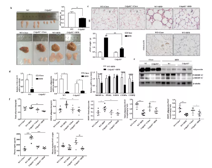 脂聯(lián)素對(duì)肝細(xì)胞有重要的抗脂肪變性作用。因此,為了檢測(cè)Colgalt2對(duì)脂聯(lián)素的影響,作者研究了脂聯(lián)素在白色脂肪組織WAT中的表達(dá)、血漿總脂聯(lián)素和HMW脂聯(lián)素水平。出人意料的是,在Colgalt2缺陷的小鼠中觀察到部分脂肪營(yíng)養(yǎng)不良。與WT小鼠相比,Colgalt2?/?小鼠(6周齡)的eWAT體重降低(圖4b)。此外,在HFD喂養(yǎng)16周后,Colgalt2敲除抑制小鼠的脂肪組織擴(kuò)張,而在WT小鼠脂肪組織明顯體積增大(圖4b)。脂肪形成由復(fù)雜的轉(zhuǎn)錄因子網(wǎng)絡(luò)(C/EBP家族成員,PPARγ,SREBP-1c等) 控制,這些因子在脂聯(lián)素基因表達(dá)、代謝和其他脂肪特異性基因中發(fā)揮重要作用。在HFD喂養(yǎng)的Colgalt2?/?小鼠中,C/EBPα、C/EBPβ和脂肪生成標(biāo)記物SREBP1a有降低趨勢(shì)(圖4d)。此外,在HFD喂養(yǎng)的Colgalt2?/?小鼠中,p-SREBP-1c和n-SREBP- 1c蛋白表達(dá)明顯下調(diào)(圖4e)。