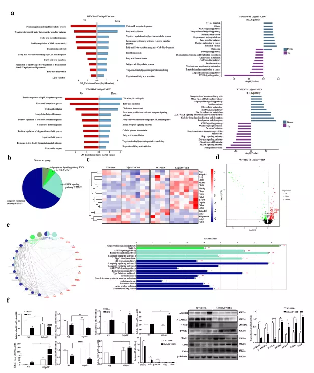 為了探索NAFLD中Colgalt2缺乏的潛在機(jī)制,作者對(duì)WT小鼠和飼喂HFD或標(biāo)準(zhǔn)飼料的Colgalt2?/?小鼠肝組織進(jìn)行ONT全長(zhǎng)轉(zhuǎn)錄組測(cè)序。結(jié)果顯示,與WT小鼠相比,HFD喂養(yǎng)的Colgalt2?/?小鼠中有321個(gè)DEGs。為了明確DEGs的功能,分別對(duì)上調(diào)和下調(diào)的 DEGs進(jìn)行KEGG通路富集分析(P < 0.05) (圖5a)。對(duì)于上調(diào)的基因,KEGG分析顯示這些差異表達(dá)基因顯著富集于MAPK信號(hào)通路、NAFLD、和氧化磷酸化。下調(diào)的基因富集于脂肪消化和吸收、甘油脂代謝。在這些途徑中,19個(gè)差異表達(dá)基因與脂代謝密切相關(guān),包括adipoR1、adipoR2和脂質(zhì)合成相關(guān)的分子,包括Cidea和Cidec (FSP27)、Cd36和PPARγ(圖5c)。為了進(jìn)一步研究這19個(gè)基因在這些通路中的作用,使用ClueGO和CluePedia工具解讀這些通路網(wǎng)絡(luò)(圖5 d)。這些基因在AMPK信號(hào)通路、脂肪細(xì)胞因子信號(hào)通路和NAFLD等中富集(圖5 b和e)。