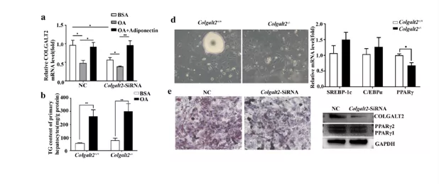 為了探究COLGALT2缺乏在脂肪萎縮中的作用, 在3T3-L1細(xì)胞中誘導(dǎo)了前脂肪細(xì)胞分化,從Colgalt2?/?和WT小鼠的eWAT中分離原代前脂肪細(xì)胞(圖6d)。油紅 O染色結(jié)果顯示干擾Colgalt2降低了前脂肪細(xì)胞分化為脂肪細(xì)胞(圖6e)。此外,干擾Colgalt2下調(diào)了脂肪前細(xì)胞向脂肪細(xì)胞分化過(guò)程中PPARγ的表達(dá)(圖6e)。此外,從Colgalt2?/?和WT小鼠的eWAT中分離出原代前脂肪細(xì)胞,結(jié)果顯示,Colgalt2敲除降低了PPARγ mRNA水平(圖6d)。然而,來(lái)自Colgalt2?/?和WT小鼠的原代前脂肪細(xì)胞分化后,C/EBPα、C/EBPβ或SREBP-1c mRNA水平無(wú)顯著差異。