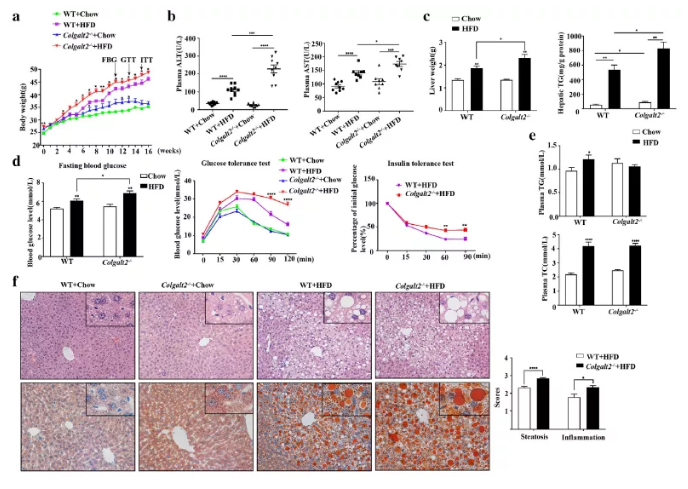 血液ALT和AST水平表明HFD喂養(yǎng)的Colgalt2?/?小鼠的肝損傷加重。HFD喂養(yǎng)的Colgalt2?/?小鼠血漿中ALT和AST水平分別比WT小鼠高2倍和1.2倍(圖2b)。然而,HFD喂養(yǎng)的Colgalt2?/?小鼠和WT小鼠的血漿TG、TC和HDL水平?jīng)]有顯著差異(圖2e)。此外,空腹血糖(FBG)、GTT和ITT表明HFD小鼠的胰島素敏感性受損(圖2c)。在HFD喂養(yǎng)的小鼠中,與WT小鼠相比Colgalt2?/?小鼠的FBG水平在11周后增加了13%(圖2c)。GTT和ITT檢測(cè)發(fā)現(xiàn)HFD小鼠的循環(huán)葡萄糖水平高于正常飼料喂養(yǎng)的小鼠,且在Colgalt2敲除小鼠中也明顯增加(圖2c)。