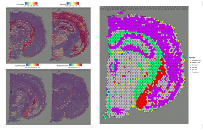 注:左圖展示單獨各個細(xì)胞類群在空間的分布情況,右圖為空間組織切片每個spot的細(xì)胞類型展示圖,不同顏色表示不同的細(xì)胞類型