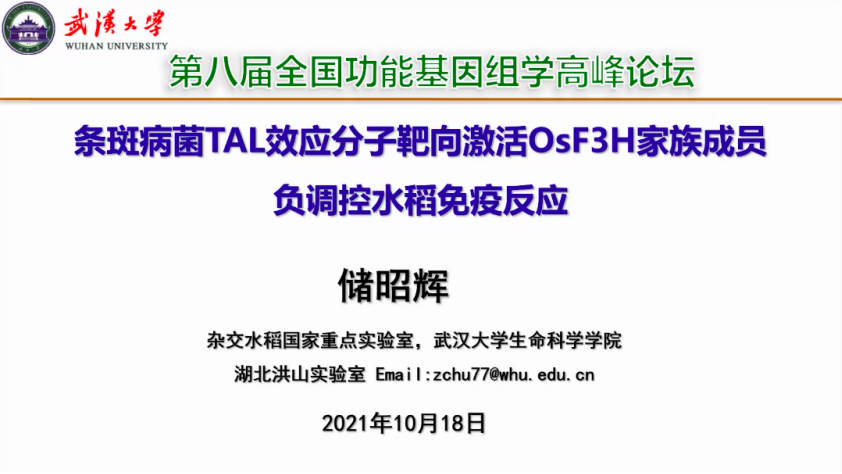武漢大學(xué)生命科學(xué)學(xué)院儲昭輝教授報(bào)告了其團(tuán)隊(duì)在水稻和條斑病菌互作上的研究進(jìn)展,講解了HGA4菌株致病力更強(qiáng)的原因是其比RS105菌株包含更多TAL效應(yīng)因子,并且表明Tal2b、Tal2c是兩個致病因子,它們通過分別靶向調(diào)控水稻中OsF3H03g、OsF3H04g基因進(jìn)而調(diào)控水稻對條斑病的抗性,最后展示了對其進(jìn)行的一系列功能驗(yàn)證與分子機(jī)制研究。