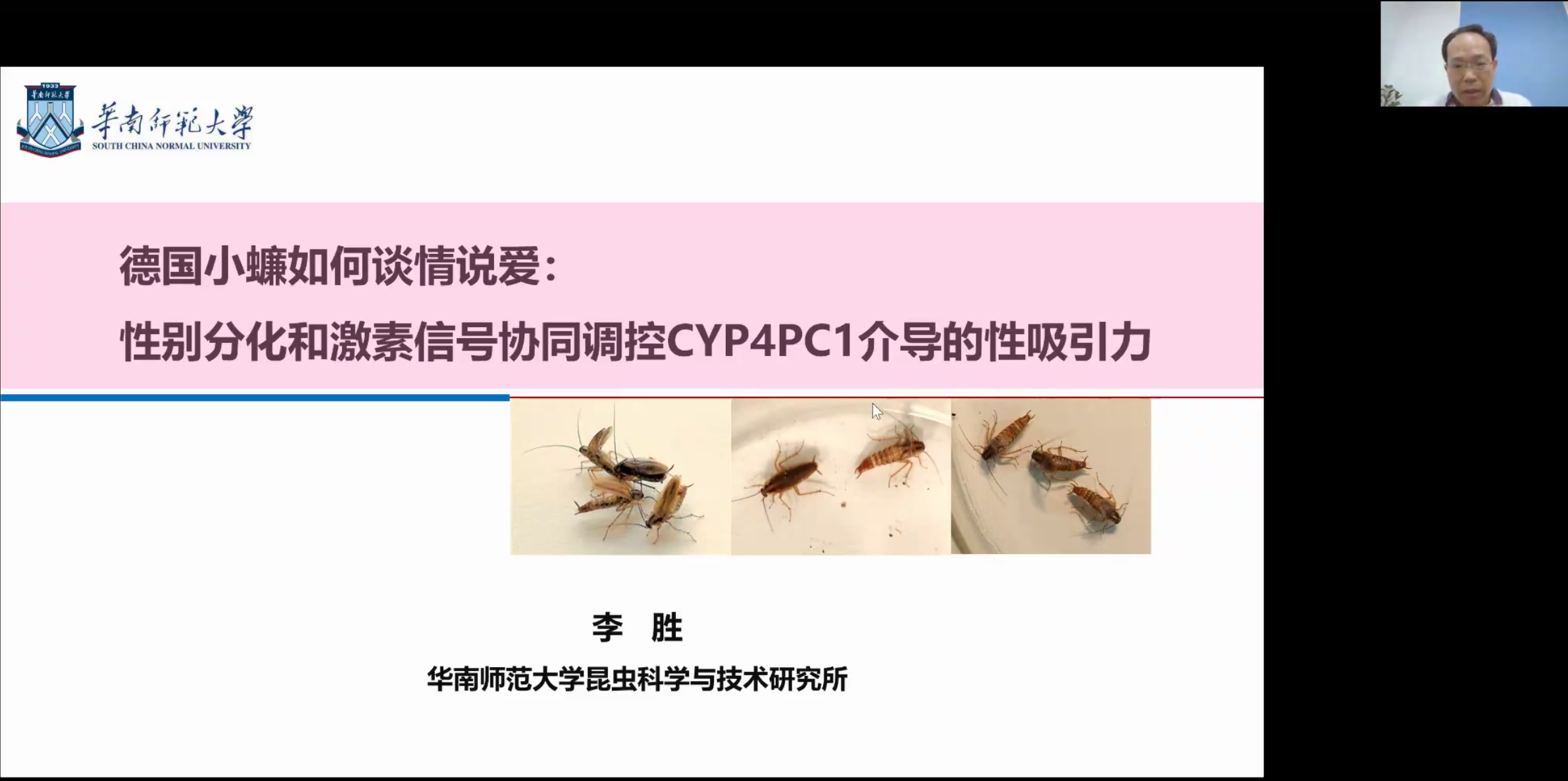 華南師范大學(xué)李勝教授風(fēng)趣的為我們介紹了德國小蠊性激素調(diào)控相關(guān)研究。研究團隊通過轉(zhuǎn)錄組及相關(guān)驗證實驗,在觸角中找尋到雄蟲中表達量高于雌蟲基因的CYP4PC1基因,該基因可能是控制信息素合成的關(guān)鍵基因。通過基因敲除的方式進一步從表型中驗證了CYP4PC1在信息素的產(chǎn)生和求偶的過程中具有重要的作用。后續(xù)研究表明,性別分化基因控制性二型CYP4PC1表達與調(diào)控,性別分化和激素信號協(xié)同調(diào)控CYP4PC1性吸引力,并使得小蠊成熟時只有一種性別具有性吸引力。最后李教授表明,通過性別分化和激素信號協(xié)同調(diào)控性吸引力可能在昆蟲和哺乳動物中普遍存在。
