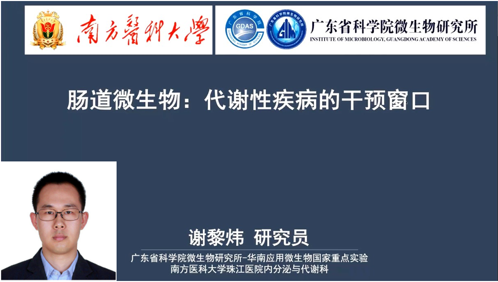 廣東省微生物研究所謝黎煒研究員講解了“腸道微生物:代謝性疾病的干預(yù)窗口”謝老師首先介紹了腸道菌群是多因素誘發(fā)肥胖癥的承載體,代謝性疾病,例如:2型糖尿病,肥胖和代謝性肝病等,嚴重損害身體健康,甚至致殘致死。研究發(fā)現(xiàn)代謝性疾病的發(fā)生和發(fā)展伴隨腸道微生物多樣性、種類和功能的變化,謝老師團隊近期開展的短期理床低碳減重研究和益生菌代謝產(chǎn)物緩解機體糖脂代謝的研究為代謝性疾病的腸道干預(yù)提供了有力的證據(jù)。