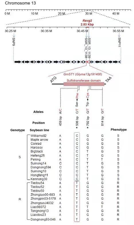 大豆[Glycine max(L.)Merr。]是一種在世界范圍內(nèi)種植的重要油料作物,是人類豐富的植物油和蛋白質(zhì)來源。但許多病原體優(yōu)先攻擊大豆。這些攻擊導(dǎo)致嚴(yán)重的產(chǎn)量損失和質(zhì)量下降。在全世界攻擊大豆的病原體中,大豆花葉病毒(SMV)是通過蚜蟲和感染的種子非持久性傳播的,是最廣泛和破壞性最大的疾病之一。SMV感染通常會使大豆產(chǎn)量降低10–30%,但在嚴(yán)重暴發(fā)時,損失可能達(dá)到50–100%。根據(jù)大豆品種中SMV感染的癥狀,包括典型的葉片圖案,葉片變形,植物發(fā)育不良,頂部壞死和種子斑點(diǎn),將SMV菌株分為7種主要致病型:G1-G7。由于種子的可傳播性,所有主要大豆生產(chǎn)國都存在菌株致病型(G1-G7)。目前,有4個主要的SMV抗性基因座(Rsv1,Rsv3,Rsv4和Rsv5),大豆基因組的可用性加快了分子標(biāo)記的開發(fā)和Rsv基因座候選基因的鑒定。最主要的Rsv1基因座是最復(fù)雜的,它包含編碼NBS-LRR蛋白的基因簇,這個染色體區(qū)域還攜帶多種病原體抗性基因,一大類同源NBS-LRR序列聚集在Rsv1基因座上,據(jù)推測,DNA的兩個片段分別是3gG2(Glyma.13g190800的等位基因)和5gG3(Glyma.13g190000的等位基因),是Rsv1的最可能的候選基因,針對Rsv3,Rsv4也進(jìn)行了相關(guān)的研究。盡管針對每個Rsv基因座篩選了候選基因,但除了Rsv4以外,沒有一個關(guān)鍵基因被完全闡明。本研究中使用重組自交系RIL群體和F2分離群體,確定并精細(xì)繪制了SMV抗性基因座Rsvg2;分離候選基因的同時,使用表達(dá)分析和遺傳轉(zhuǎn)化測定法驗證了其功能。最終發(fā)現(xiàn),Rsvg2編碼磺基轉(zhuǎn)移酶(SOT),GmST1,與AtSOT15(AT5G07010)同源,為大豆對SMV的抗性提供了新的可能解釋。