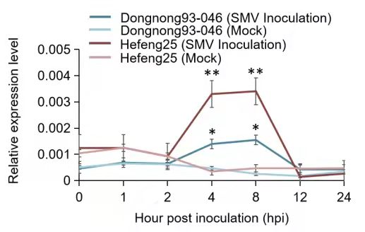 圖2 GmST1基因在抗SMV的Dongon93-046和SMV感的Hefeng25中的相對表達(dá)