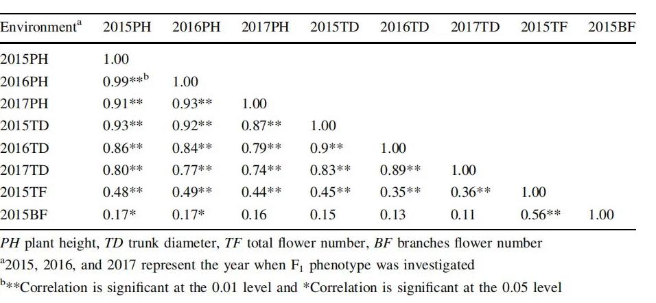 在2015-2017年,對(duì)F1群體的4個(gè)表型性狀進(jìn)行了評(píng)估,其中,PH是通過(guò)用尺子測(cè)量從地面到樹(shù)冠頂部的方式來(lái)調(diào)查;TD是記錄移接處上方10cm的直徑;TF和BF是計(jì)算總花數(shù)和分支花數(shù)。此外,相關(guān)性分析顯示,PH和TD呈顯著正相關(guān)(r>0.74, p<0.01)。