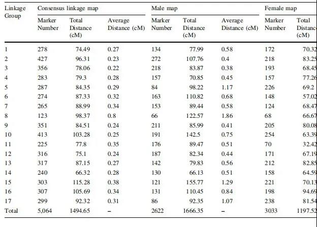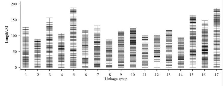 最后,利用HighMap將5113個(gè)高質(zhì)量SLAF標(biāo)記用于遺傳圖譜構(gòu)建,其中,雌性圖譜包含2622個(gè)SLAF標(biāo)記,總圖距1666.35cM。雄性圖譜包含3033個(gè)SLAF標(biāo)記,總圖距為1197.52cM。中性圖譜包含5064個(gè)SLAF標(biāo)記,形成17條連鎖群,總圖距為1494.65cM,平均圖距為0.36cM。在該圖譜中,有189個(gè)SLAF標(biāo)記在11個(gè)連鎖群中存在偏分離,包含112個(gè)SLAF標(biāo)記的LG7標(biāo)記偏分離率*高。在LG1、LG2、LG3、LG6、LG12和LG16中均未出現(xiàn)偏分離現(xiàn)象。并對(duì)以上圖譜進(jìn)行了單體來(lái)源評(píng)估、熱圖評(píng)估和共線性評(píng)估,結(jié)果表明該圖譜是高質(zhì)量的評(píng)估遺傳圖譜。