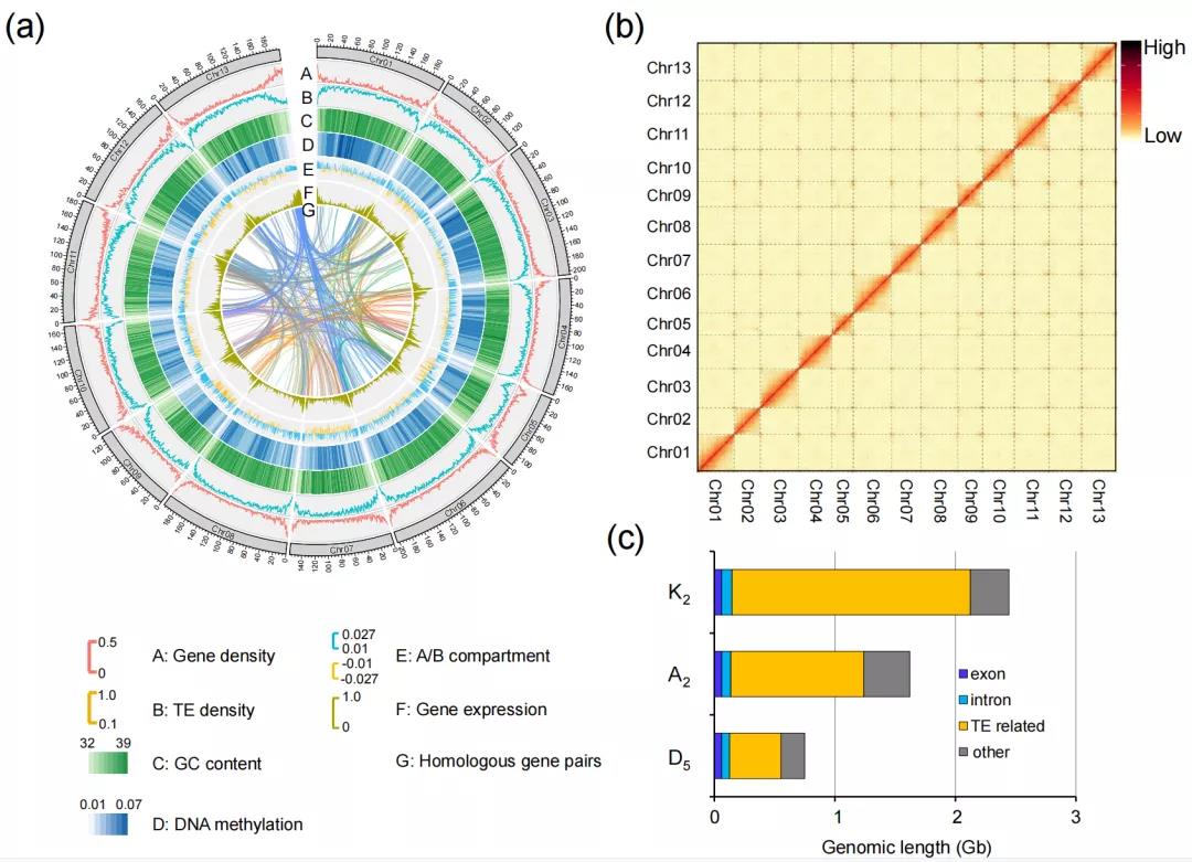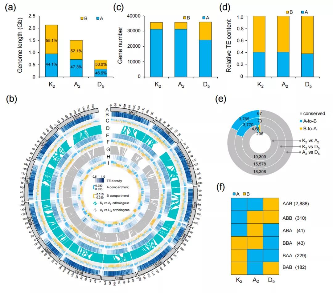 植物染色質(zhì)被劃分為“活性”(A)或“非活性”(B)區(qū)域,通常分別對應(yīng)于常染色質(zhì)和異染色質(zhì)。HiC染色質(zhì)互作分析發(fā)現(xiàn),與基因組大小的差異一致,與A2或D5相比,K2基因組的活躍區(qū)域(約占基因組的44%)較少,而非活躍區(qū)域(55%)較多。較大的K2和A2基因組在A/B compartment之間表現(xiàn)出更多的插入,與這些較大基因組中發(fā)現(xiàn)的富含TE的區(qū)域相對應(yīng)。A2/K2與D5相比多了約7000個基因,這與活躍的轉(zhuǎn)座子擴增相關(guān)。對于較大的基因組,一個compartment中TEs的比例也稍大,表明這些較大基因組(K2和A2)所顯示的A/B compartment變化模式導(dǎo)致更擴散的邊界,并在A compartment中包含更多的基因和TEs。