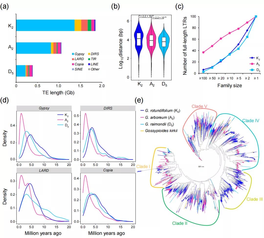 本次研究首次公布了棉屬中二倍體圓葉棉基因組,并對亞洲棉和雷蒙德氏棉基因組進行了升級,解析了轉(zhuǎn)座子活動驅(qū)動的基因組大小進化特征,從轉(zhuǎn)座子擴增和染色質(zhì)空間結(jié)構(gòu)角度為棉花物種進化提供新的見解,為植物中轉(zhuǎn)座子活動介導(dǎo)的轉(zhuǎn)錄調(diào)控進化研究提供參考。