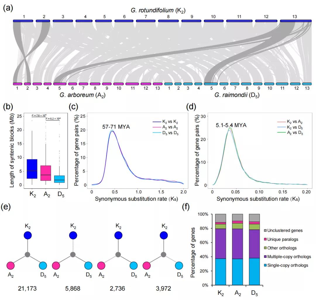比較基因組分析表明,A2和K2基因組在Chr01與Chr02染色體間存在一個大的易位;K2和D5基因組在Chr13與Chr05染色體間存在一個大的易位。Ks分析與前期研究一致,結(jié)果表明,三個棉種在57-71百萬年前存在一次共同的全基因組復(fù)制事件(圖3),并在5.1-5.4 百萬年前發(fā)生物種分化,K2、A2和D5基因組與它們最近的外類群約在8.5-10 百萬年前發(fā)生了分化。由于這三個基因組來自同一祖先,作者探討了物種形成后共線基因丟失和增加的程度。分析表明結(jié)果表明,K2和D5/A2之間的比較顯示 K2缺失基因數(shù)量最多(D5和A2有5868個共線,而K2中沒有).使用OrthoMCL進行的基因家族分析,發(fā)現(xiàn)三個棉中每個基因組大約有15%特異的基因家族。