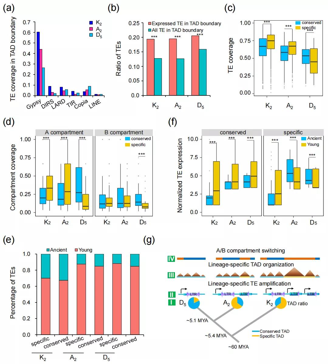 基于邊界TE覆蓋度,邊界TE表達以及TE插入時間分析,發(fā)現(xiàn)K2不保守的TAD邊界存在特異的和較新的轉(zhuǎn)座子(物種分化后爆發(fā)的TE)插入。這些結(jié)果表明最近在K2和A2基因組中表達的TEs的擴增可能有助于在三個物種分化后形成譜系特異性TAD邊界?;谶@些結(jié)果,作者提出了三個棉種分化過程中,基因組擴張-轉(zhuǎn)座子擴增介導(dǎo)的A/B compartment轉(zhuǎn)換和TAD重組的進化模型(圖6)。