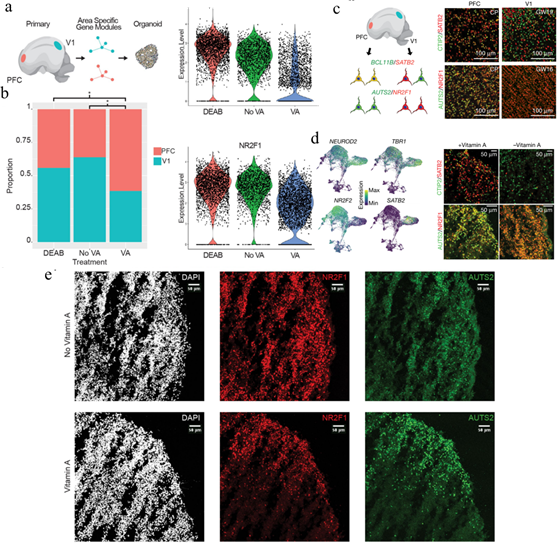 在哺乳動(dòng)物大腦發(fā)育的過程中,視黃酸信號(hào)在神經(jīng)組織中發(fā)揮著重要的作用。為了測試RA是否促進(jìn)人類PFC的分化,在含有或不含有維生素A(RA合成的前體)的情況下培養(yǎng)皮質(zhì)類器官。同時(shí)利用DEAB(一種有效的RA合成抑制劑)處理與維生素A一起培養(yǎng)的腦類器官。在分化的第10周,此時(shí)深層神經(jīng)正在發(fā)生,利用scRNA-seq分析了腦類器官。發(fā)現(xiàn)在維生素A存在下培養(yǎng)的興奮性前腦神經(jīng)元與不含維生素A或在DEAB存在下培養(yǎng)的腦類器官的神經(jīng)元是分開聚類的。還發(fā)現(xiàn)了區(qū)分PFC和V1皮層神經(jīng)元的信號(hào)。利用目前的分類方法注釋類器官神經(jīng)元中的PFC和V1神經(jīng)元的特征;與未使用維生素A培養(yǎng)或使用DEAB處理的神經(jīng)元相比,維生素A培養(yǎng)的類器官中PFC類似神經(jīng)元的比例始終較高。免疫染色證實(shí)了基因產(chǎn)物的差異表達(dá),并發(fā)現(xiàn)與含有維生素A培養(yǎng)的腦類器官的PFC特性一致。這些發(fā)現(xiàn)表明,RA信號(hào)通路有助于人類皮質(zhì)發(fā)育過程中PFC神經(jīng)元譜系的發(fā)育。