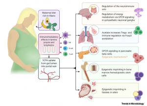 圖1.短鏈脂肪酸(SCFA)對腸道以外的器官和組織的影響,包括發(fā)育中的胎兒。富含不可消化纖維的飲食可促進微生物發(fā)酵和結(jié)腸中SCFA的產(chǎn)生,從而通過直接作用于腸道上皮細胞和免疫細胞來促進粘膜動態(tài)平衡。[2]