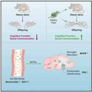 親肥胖與兒童認知和社交能力低下密切相關(guān)。此外,已經(jīng)證明,母親肥胖會破壞后代的行為和腸道微生物群,母鼠或后代的高纖維飲食通過減輕突觸損傷和小膠質(zhì)細胞成熟缺陷恢復(fù)了這兩種行為和腸道微生物群。共同居住和糞便微生物群移植實驗揭示了微生物群與行為變化之間的因果關(guān)系。此外,用微生物群衍生的短鏈脂肪酸治療也減輕了肥胖母鼠后代的行為缺陷??傊?,研究表明,微生物群代謝物腦軸可能是母親肥胖引起的認知和社會功能障礙的基礎(chǔ),高膳食纖維攝入可能是一種有希望的干預(yù)措施。
