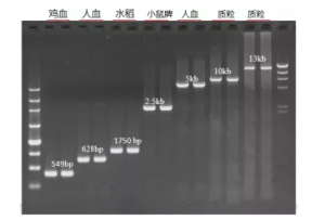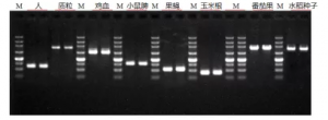 圖2:分別以人、雞、小鼠、昆蟲、質(zhì)粒、玉米、水稻、番茄的全基因組DNA為模板,擴增長度分別為628 bp、2.5 kb、1750 bp、750 bp、549 bp、300 bp、1.5 kb、1.2 kb的目標片段。M:250 bp DNA Marker。