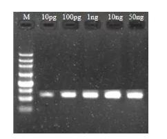 圖4:使用Biomarker HS DNA聚合酶,以不同模板量(10 pg、100 pg、1 ng、10 ng、500 ng)人基因組DNA為模板,擴增 628 bp的目的片段,發(fā)現(xiàn)不同模板量都可有效擴增。M:250 bp DNA Marker。