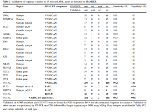 HAMLET的VARSCAN組件在13個(gè)AML基因中鑒定出246個(gè)小變異體。HAMLET對(duì)NPM1和DNMT3A的FLT3-ITD和熱點(diǎn)區(qū)域進(jìn)行了敏感性評(píng)估,對(duì)其余的418個(gè)被HAMLET稱為野生型的樣本進(jìn)行了靶向重測(cè)序反應(yīng)。VARSCAN只識(shí)別了七個(gè)相當(dāng)短的FLT3-34人中的ITDFLT3-ITD攜帶AML。在這種情況下,HAMLET都正確地識(shí)別了一個(gè)ASXL1(3-030)的30bp C末端插入和CEBPA (3-003)中一個(gè)N端易位。HAMLET檢測(cè)到的小變異體的總體類型和分布與在COSMIC中報(bào)告的分布非常一致。