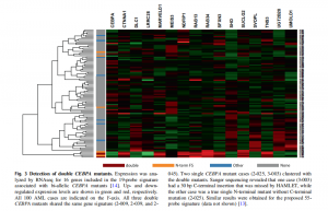 等位基因的CEBPA突變?yōu)楹诵驼5腁ML帶來(lái)了良好的預(yù)后并且將一個(gè)等位基因上編碼序列的第一個(gè)357 bp內(nèi)的N-末端移碼突變與c.834-1074之間的C-末端框內(nèi)插入或缺失相結(jié)合,從而破壞另一個(gè)等位基因上的DNA結(jié)合。通過(guò)Illumina平臺(tái)上通常可獲得的reads長(zhǎng)度來(lái)證明它們?cè)谙喾慈旧w上的位置。然而,雙等位基因CEBPA突變與特定的基因表達(dá)譜有關(guān)?;趍RNAseq的基因表達(dá)譜顯示了特征性的雙等位基因CEBPA攜帶兩個(gè)樣本的所有四個(gè)急性髓系白血病樣本的突變相關(guān)特征CEBPA突變(2-009、2-039、2-045和3-003),包括其C端突變被HAMLET遺漏的病例3-003(圖3)。11例急性髓系白血病中,有一例CEBPA變異,一個(gè)病例(2-025)的特征性N-末端移碼突變與雙聚在一起CEBPA變異。因此,將變異檢測(cè)與基因表達(dá)譜結(jié)合分析,可以單獨(dú)解決變異檢測(cè)的不確定性。由于CEBPA 雙突變體的基因標(biāo)記不是定量的,所以尚未在HAMLET中實(shí)施臨床應(yīng)用。