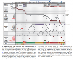 根據(jù)HAMLET和中期核型分析結(jié)果,99例病例可根據(jù)世衛(wèi)組織2016年和基因組分類進(jìn)行重新分類(圖6)。HAMLET信息促進(jìn)了6個(gè)案例的風(fēng)險(xiǎn)重新評(píng)估,值得注意的是通過(guò)NUP98-NSD1融合而無(wú)分類明確病變的AML,或通過(guò)EVIl過(guò)表達(dá)而無(wú)inv(3)(q21q26)來(lái)分配風(fēng)險(xiǎn)。