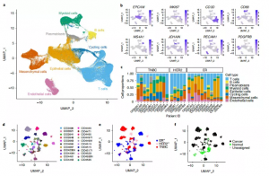 在TNBC樣本中,IFITl/c6、LAG3/c8 和MKI67/C11的T細胞比例更高(圖3c)。值得注意的是,在TNBC中LAG3/C8消耗的CD8亞群顯著表達PD-1、LAG3、CD27和CD70配受體,可增強T細胞的細胞毒性(圖4f)。在不同的臨床亞型中,檢查點分子表達的差異更為明顯,包括在非免疫細胞(如CAFs)上。這些數(shù)據(jù)提供了對每種亞型疾病最適合的免疫治療策略的見解。