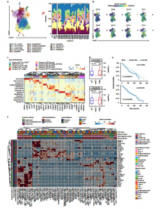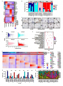 作者又在患者中發(fā)現(xiàn)了18個T細胞和先天淋巴細胞簇(圖3a)。在這5個CD8集群中,由3個高表達抑制性檢查點分子包括 LAG3、PDCDI 和 TIGIT和2個低表達 IFNG 和 TNF的CD8 + T細胞組成。另外還發(fā)現(xiàn)了由1型干擾素(IFN-I)信號和增殖驅(qū)動的兩個簇,它們都由CD4+和CD8+ T細胞組成。通過αβ T細胞受體和NK標記的表達,作者還鑒定了自然殺傷細胞(NK)和自然殺傷T (NKT)樣細胞。