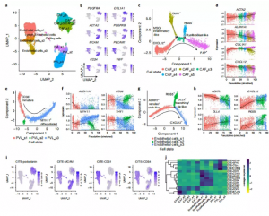 在基質(zhì)室中,作者鑒定了三種主要的細胞類型(圖5a,b)。Monocle2的偽時間軌跡分析揭示了5種CAF狀態(tài)。狀態(tài)1(s1)具有高表達的間充質(zhì)干細胞(MSCs)和炎性樣CAFs (iCAFs)特征。當細胞向分化狀態(tài)s4和s5過渡時,這些標記物的表達減少,這種分化狀態(tài)通過增加ACTA2 (aSMA)、TAGLN、FAP和COL1A1的表達和富集ECM相關(guān)通路而類似于肌成纖維細胞樣CAF狀態(tài)。