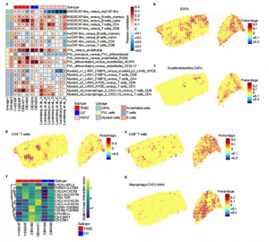 雖然一些研究表明間充質(zhì)細胞在調(diào)節(jié)抗腫瘤免疫中發(fā)揮重要作用,但基質(zhì)細胞和免疫細胞之間的相互作用尚未在組織中被闡明。作者在6例病患中發(fā)現(xiàn)5例肌成纖維細胞樣CAFs和iCAFs 之間存在中度負相關(guān)性(圖7a-c)。CAF定位在7個HER2+乳腺腫瘤的獨立空間轉(zhuǎn)錄組數(shù)據(jù)是一致的,表明這種關(guān)系在不同的臨床亞型中是保守的(圖7a)。與上述iCAFs的免疫調(diào)節(jié)特性一致的是,在兩項研究中,iCAFs均與多個淋巴細胞群體共定位(圖7a,d,c)。在6個樣本中,肌成纖維細胞樣CAFs與CD8+T細胞相關(guān)(圖7a),揭示與高TIL浸潤或免疫炎癥表型的浸潤性乳腺癌的功能相關(guān)。通過整合信號預(yù)測和細胞鄰近性,這些數(shù)據(jù)突出了 CAFs直接調(diào)控免疫細胞的相關(guān)候選因子。