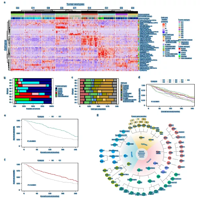 作者在26個腫瘤中觀察到顯著的變異和細胞頻率的重復(fù)模式,并從單細胞數(shù)據(jù)集中估計細胞組分,發(fā)現(xiàn)捕獲的細胞組分和預(yù)測的比例之間具有良好的整體相關(guān)性,大多數(shù)細胞類型出先顯著相關(guān)性。作者還觀察到在匹配bulk-PAM50分類的腫瘤中,聚類顯示9個細胞組成相似的腫瘤簇(“生態(tài)型”)(圖8a-c)。這些生態(tài)型與腫瘤亞型、sc亞型細胞和主要細胞類型的多樣性相關(guān)(圖8a)。Ecotype 3(E3)在含有Basal_SC等細胞和基底樣PAM50亞型的腫瘤中富集(圖8a,b)。El、E5、E6、E8和E9主要由管腔細胞組成。E4對與抗腫瘤免疫相關(guān)的免疫細胞高度富集(圖8a)。E2 主要由 LumA 和正常樣腫瘤組成(圖8a,b)。
