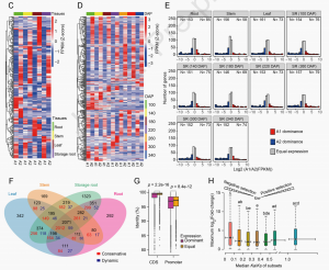 蛋白質(zhì)編碼基因、不同等位基因和顯性表達(dá)的雙等位基因的密度,發(fā)現(xiàn)它們都傾向于富集在高度雜合的區(qū)域,通常位于染色體的一端或兩端附近。通過(guò)對(duì)不同種植時(shí)間和組織部位的轉(zhuǎn)錄組分析發(fā)現(xiàn)除了第1、15和17對(duì)染色體外,幾乎所有同源染色體對(duì)中,雙等位基因間廣泛發(fā)生表達(dá)不平衡,并且淀粉和蔗糖代謝途徑上的雙等位基因表現(xiàn)出顯著的表達(dá)分化;