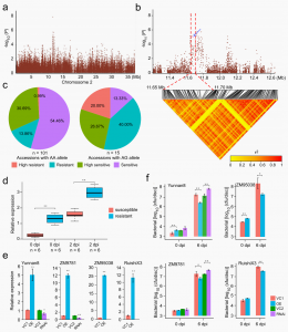 R1周?chē)s合性降低的選擇信號(hào),并且MeTIR1在攜帶GG等位基因的材料中的表達(dá)顯著高于攜帶CG和CC等位基因的材料(圖4i),說(shuō)明MeTIR1純合變異促使塊根淀粉含量提升。并通過(guò)瞬時(shí)過(guò)表達(dá)和沉默技術(shù)進(jìn)一步驗(yàn)證了MeTIR1在木薯中的功能。進(jìn)一步結(jié)合關(guān)聯(lián)分析發(fā)現(xiàn),對(duì)2號(hào)染色體攜帶MeAHL17 AA等位基因的材料,經(jīng)選擇馴化促使塊根產(chǎn)量提升的同時(shí)導(dǎo)致木薯細(xì)菌性枯萎病抗性丟失。