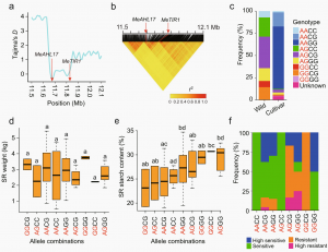 MeAHL17和MeTIR1位于2號(hào)染色體上相同的選擇性清除區(qū)內(nèi)。連鎖不平衡分析發(fā)現(xiàn),兩個(gè)基因緊密連鎖,攜帶AG(MeAHL17)和GG(MeTIR1)等位基因組合的品種顯示出較高的淀粉含量和對(duì)木薯細(xì)菌性枯萎病的高抗性頻率。