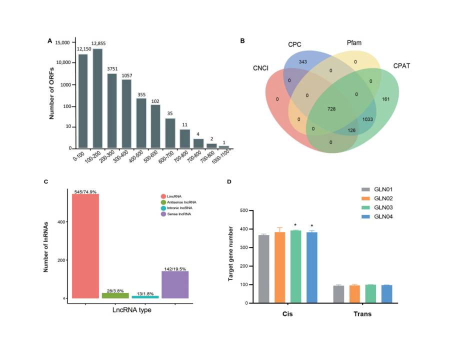 總共鑒定了38108個(gè)ORF,包括30323個(gè)(79.57%)完整的ORF,它們同時(shí)具有起始密碼子和終止密碼子。就完整的ORF而言,100-200 bp(12855個(gè)ORF)、0-100 bp(12150個(gè))和200-300 bp(3751個(gè))長(zhǎng)度所占比例最大(圖3A)。共鑒定出728個(gè)lncRNAs,平均長(zhǎng)度在298到4362 nt之間。這些lncRNAs進(jìn)一步分類為545個(gè)基因間區(qū)lncRNAs(74.86%)、28個(gè)反義lncRNAs(3.85%)、13個(gè)內(nèi)含子lncRNAs(1.79%)和142個(gè)正義lncRNAs(19.50%)(圖3C)。研究還發(fā)現(xiàn),這些lncRNAs調(diào)控的順式靶基因比那些反式靶基因多(圖3D)。發(fā)現(xiàn)在GLN01和GLN03之間(Student t檢驗(yàn),p=0.002),以及GLN01和GLN04之間(p=0.037),這些lncRNAs調(diào)控的順式靶基因顯著增加,而這些lncRNAs調(diào)控的反式靶基因在整個(gè)莖發(fā)育過程中未發(fā)現(xiàn)顯著變化。