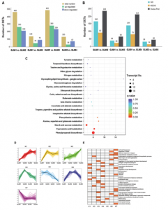 結(jié)果顯示GLN01和GLN04之間有492個(gè)DET,其中283個(gè)上調(diào),209個(gè)下調(diào)(圖5A)。接著是GLN01和GLN02,GLN01和GLN03,分別有468個(gè)和136個(gè)。富集分析結(jié)果顯示,GLN01和GLN04之間的DET在三條KEGG途徑:“苯丙烷生物合成”(16個(gè)DET)、“淀粉和蔗糖代謝”(10個(gè)DET)和“氰基氨基酸代謝”(8個(gè)DET)中顯著富集(圖5C)。