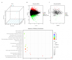 共鑒定出1390個(gè)mRNAs(671個(gè)上調(diào),719個(gè)下調(diào))和50個(gè)lncRNAs(22個(gè)上調(diào),28個(gè)下調(diào))(圖4B和C)。在本研究中,預(yù)測(cè)DE-lncRNAs與其靶mRNA協(xié)同發(fā)揮其功能,從而說明珊瑚對(duì)環(huán)境變化的適應(yīng)。對(duì)lncRNA靶向mRNAs進(jìn)行KEGG富集分析,以探索鹿角珊瑚lncRNAs的功能。根據(jù)KEGG分析,DE-lncRNA靶向mRNA在五條途徑中顯著富集(q值<0.05),如ko00603鞘糖脂生物合成-球狀系列、ko00531氨基糖降解、ko00604鞘糖脂生物合成-神經(jīng)節(jié)苷脂系列、ko00511其他聚糖降解、ko04142溶酶體、,ko00520氨基糖和核苷酸糖代謝,以及ko03013 RNA轉(zhuǎn)運(yùn)。