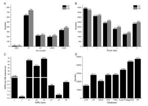 六個(gè)樣本的平均全長(zhǎng)嵌合序列FLNC讀取率達(dá)到80.68%,平均獲得20360個(gè)非冗余轉(zhuǎn)錄本,平均N50長(zhǎng)度和平均長(zhǎng)度分別為1607bp和1378bp(表 1),這比之前獲得的根轉(zhuǎn)錄組數(shù)據(jù)要好。LR和HR組的平均AS事件分別為1408和1605??勺兗羟蟹治鼋Y(jié)果顯示最常見(jiàn)的剪接類型是內(nèi)含子保留,LR組占45.41%,在HR組占有46.29%(圖1 A)?;コ馔怙@子最不常見(jiàn),在LR和HR轉(zhuǎn)錄組中分別為0.86%和1.04%。APA分析顯示具有一個(gè)多聚(A)位點(diǎn)的基因數(shù)量最高,LR和HR組的平均基因數(shù)分別為3896和3733,具有五個(gè)多聚(A)位點(diǎn)的轉(zhuǎn)錄本數(shù)量最低,分別為1242和1386(圖1B)。文中共對(duì)54135個(gè)序列(77606351bp)進(jìn)行了SSR分析,包括16354個(gè)SSR序列和12855個(gè)含有SSR的序列。此外,單核苷酸、二核苷酸、三核苷酸、四核苷酸、五核苷酸和六核苷酸的數(shù)量分別為5522、4258、6139、176、44和215。其中,三核苷酸SSR的密度最高,為68(圖1C)。