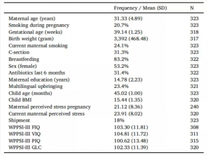 380個樣本中有364個成功進(jìn)行了微生物菌群分析(圖1)。在隨后的統(tǒng)計(jì)分析中,排除了一名孕齡較晚的受試者、35名WPPSI-III量表測試方法不準(zhǔn)確的受試者以及5名運(yùn)輸/儲存不規(guī)范的受試者,共323名受試者。對于其余的家庭,記錄人口統(tǒng)計(jì)資料(母親年齡、兒童年齡、性別),產(chǎn)前、產(chǎn)期和產(chǎn)后因素(胎齡、出生體重、吸煙情況、剖腹產(chǎn)、母乳喂養(yǎng)、母親教育、多語言教育、兒童的BMI、抗生素使用情況)以及認(rèn)知水平(WPSSI-III 總智商(FIQ),言語智商(VIQ)、操作智商(PIQ)和通用語言組合(GLC))(表1)。