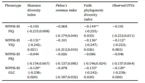 阿爾法多樣性指標(biāo)與認(rèn)知水平之間存在顯著負(fù)相關(guān)。如表3所示,F(xiàn)aith系統(tǒng)發(fā)育多樣性指數(shù)與WPPSI-III FIQ之間的顯著關(guān)聯(lián)。同時(shí)發(fā)現(xiàn)抗生素的使用與Shannon多樣性指數(shù)和Pileou均勻度呈負(fù)相關(guān),妊娠期與Shannon多樣性指數(shù)和觀測到的物種數(shù)呈負(fù)相關(guān),以及C-section與Faith的系統(tǒng)發(fā)育多樣性指數(shù)呈現(xiàn)正相關(guān)(圖S1)。