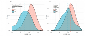 隨后對腸桿菌科內(nèi)的未知屬進(jìn)行了另外的分析,發(fā)現(xiàn)與母親年齡和吸煙與否幾個協(xié)變量是相關(guān)的。尤其是和孕婦在懷孕期間吸煙和T4時(shí)期吸煙(圖3B)相關(guān)性更為明顯。中介分析(圖3)表明腸桿菌科中該屬介導(dǎo)了孕婦妊娠期間吸煙和當(dāng)前吸煙對WPPSI-III FIQ的影響。