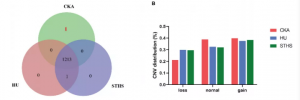 (1)例如,在416個(gè)奶山羊中鑒定得到了7,208個(gè)CNVs,GWAS分析發(fā)現(xiàn)31個(gè)CNVs所在區(qū)域與產(chǎn)奶量等性狀顯著相關(guān),并且發(fā)現(xiàn)在顯著相關(guān)的CNVs中,注釋的基因大多數(shù)在產(chǎn)奶相關(guān)的生物過(guò)程和健康相關(guān)性狀中發(fā)揮著重要作用。在另一個(gè)研究中,利用新開(kāi)發(fā)的GWAScore方法整合已發(fā)表的GWAS數(shù)據(jù)來(lái)鑒定潛在的候選位點(diǎn),并對(duì)3個(gè)不同品種(CKA,n=10、HU,n=10、STHS,n=9)山羊進(jìn)行全基因組CNVs檢測(cè)(圖3),通過(guò)將CNVs與GWAScore和QTL位點(diǎn)相整合,發(fā)現(xiàn)197個(gè)候選基因與CNVs存在重疊,進(jìn)一步鑒定得到28個(gè)與生長(zhǎng)性狀相關(guān)的CNVs。